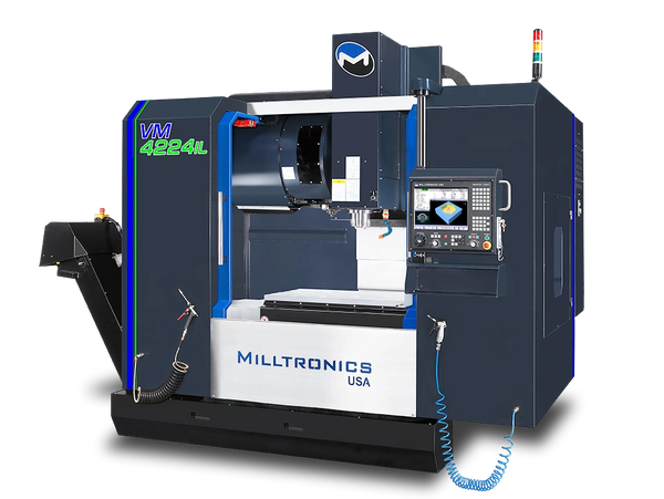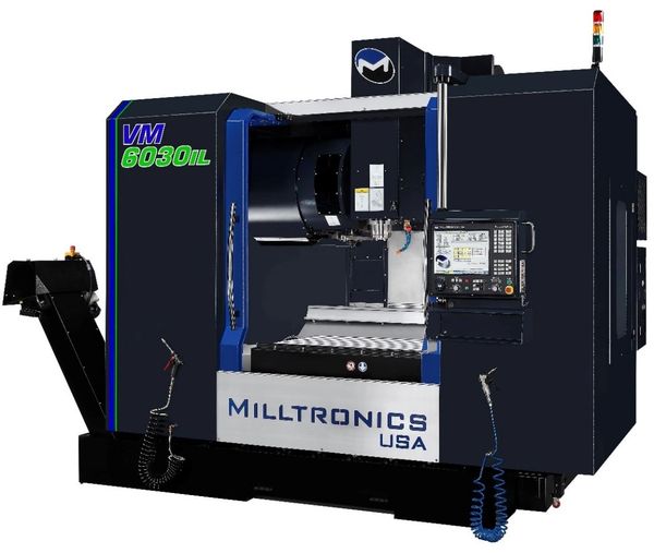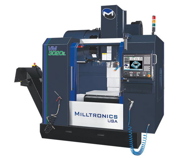 The Milltronics VM3020IL has 30″ x 18″ x 22″ travels and a 34″ x 20″ table that supports 3,140 lbs table weight at full speed. The VM3020IL has a 24 HP 12,000 RPM BIG-PLUS spindle.