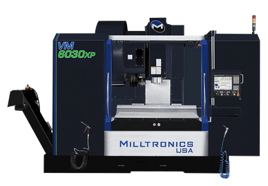 The Milltronics VM6030XP milling machine is a robust machining center with a 60 x 30 x 24-inch travel, a 66 x 30-inch table, a BIG-PLUS® ISO No. 50 spindle taper operating at a maximum speed of 8000 RPM with 35/25 HP power and 365 ft-lbs torque, a 30-tool automatic tool changer supporting CT50 tool shanks, and featuring a rapid traverse rate of 1000/787 IPM, designed for efficiency and power in a variety of machining applications.