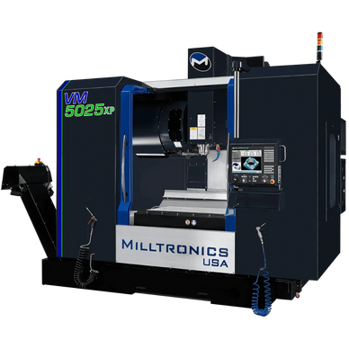 The Milltronics VM5025XP milling machine, part of the XP Series, is distinguished by its "Extra Power" design, featuring a 50 x 25 x 24-inch travel, a 54 x 25-inch table with a 3000 lbs weight capacity, and a robust BIG-PLUS® ISO No. 50 spindle taper with a maximum speed of 8000 RPM and 35/25 HP power, emphasizing enhanced rigidity with linear cross roller guides, direct-coupled ballscrews for faster response, and dual-wound spindle motors for accelerated performance and increased torque. The machine incorporates a 30-tool automatic tool changer with CT50 tool shank and MAS 60 retention knob, and its motion capabilities include a rapid traverse rate of 1000/787 IPM. The XP Series is further characterized by a heavy-duty belt drive spindle, additional standard features such as a coolant ring and washdown system, lift-up chip conveyor, and height adjustment on the control. General specifications include a machine weight of 29100 lbs, a height of 121.8 inches, and a footprint of 127.8 x 125.7 inches (165.2 inches with conveyor) in nominal operating conditions, with power requirements of 41 KVA / 102 Amps at 208-240 Volts / 3 Phase.