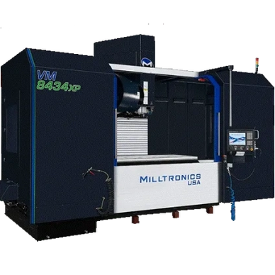 The Milltronics M8434XP is a powerful 3-axis vertical machining center with an 84 x 34 x 30-inch travel, an 86 x 34-inch table supporting up to 4750 lbs, a BIG-PLUS® ISO No. 50 spindle reaching 8000 RPM with 35/25 HP power and 365 ft-lbs torque, a 32-tool automatic tool changer with CT50 tool shanks, and a rapid traverse rate of 709/530 IPM, designed for efficiency and performance in demanding machining applications, featuring a substantial machine weight of 37260 lbs, a height of 146.4 inches, and a footprint of 203.1 x 165.4 inches (230.1 inches with conveyor) in nominal operating conditions, with power requirements of 43 KVA / 107 Amps at 208-240 Volts / 3 Phase.